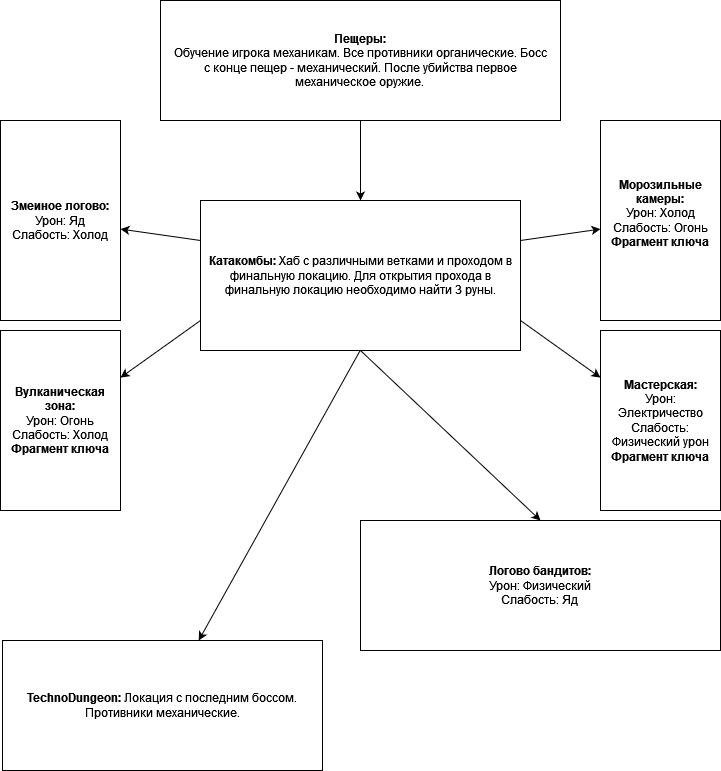 Три глобальных локации. Начальная - пещера; Хаб - катакомбы; Конечная - закопанный космический корабль, каждый из них может содержать подлокации.
